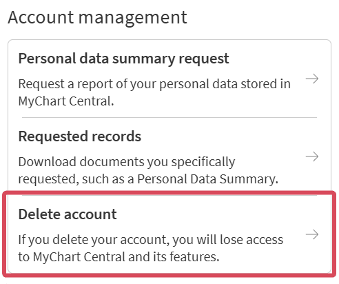 Deleting your MyChart Central account does not delete any of your health information at your linked MyChart accounts. Your data is stored and managed by your healthcare organization.