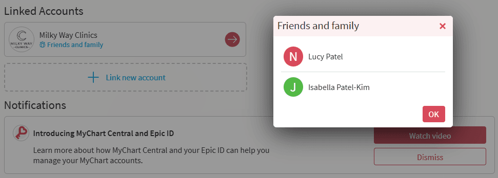 MyChart Central is focused on providing a single login experience to your linked MyChart accounts. It does not display your family's health information directly.