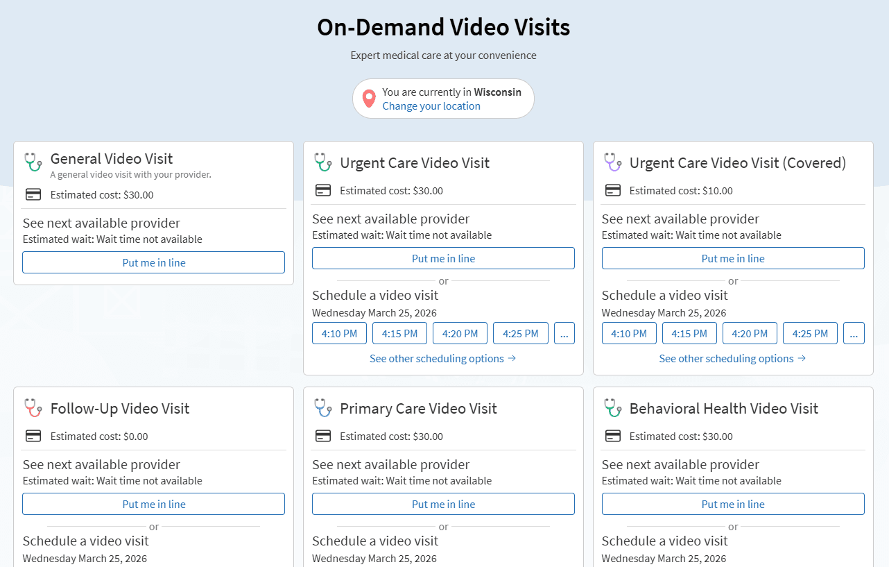 If you need to be seen right away, you can join the queue for an on-demand video visit.