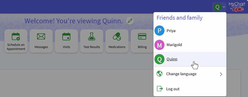 When you view someone's account as a proxy, the name of the account you are viewing appears at the top of the activity. You can switch between MyChart accounts by selecting the Switch menu in the top right corner.