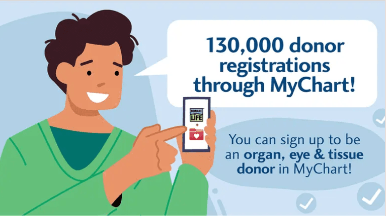 Patients can choose to be organ, eye, and tissue donors directly in MyChart—making it easier to take an important step toward saving lives, and offering hope to the more than 100,000 people in the U.S. currently waiting for a transplant. Through integration developed in collaboration with Donate Life America, each registration is added automatically to the National Donate Life Registry. One donor can save up to eight lives, restore sight to two people, and heal more than 75 people through tissue donation.